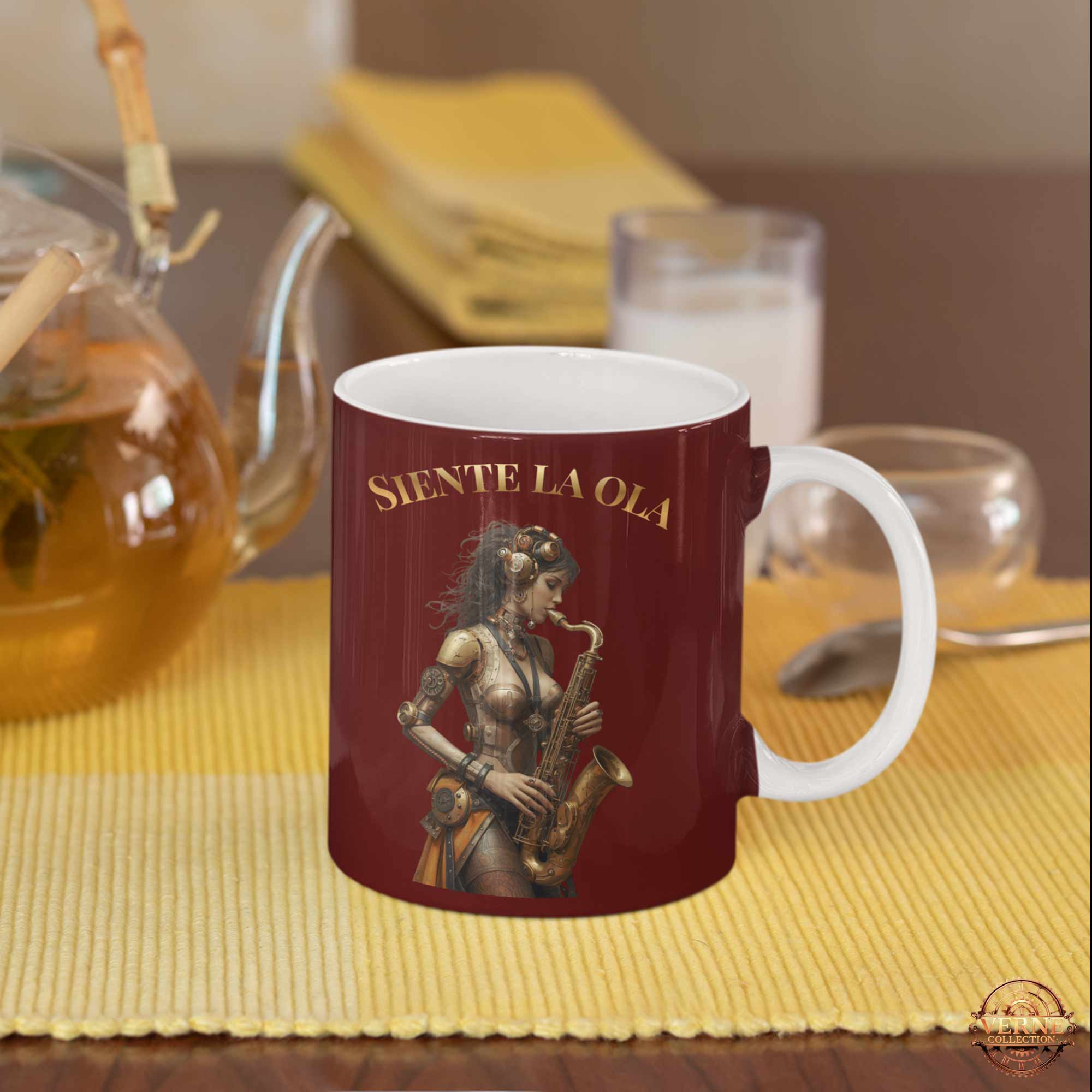 Feel the Wave is a bold slogan that captures the energy of music and motion, blending artistry with industrial fantasy. This coffee mug is more than fashion—it’s a statement for jazz lovers, steampunk enthusiasts, and anyone who wants to wear the sound of freedom.
